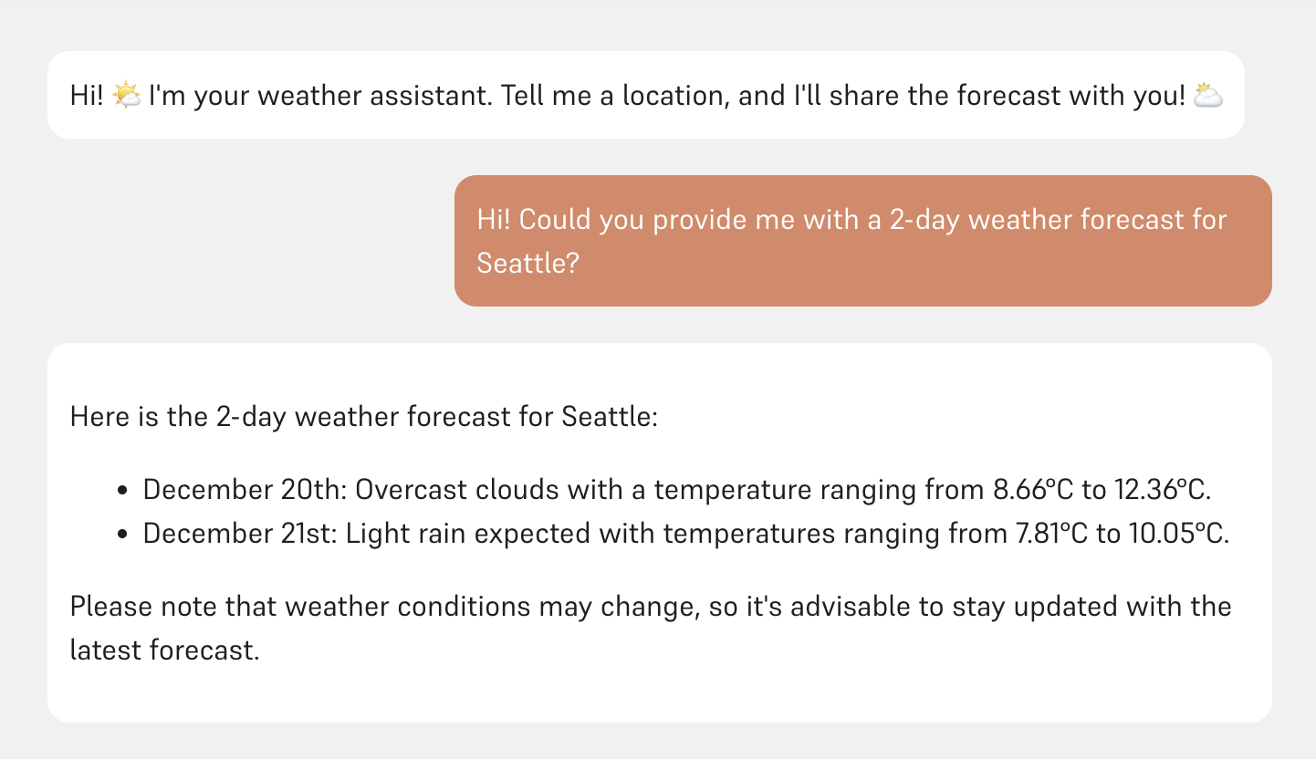 messages = h9.load('messages', [{'role': 'assistant', 'content': "Hi! 🌤️ I'm your weather assistant. Tell me a location, and I'll share the forecast with you! ⛅"}]))